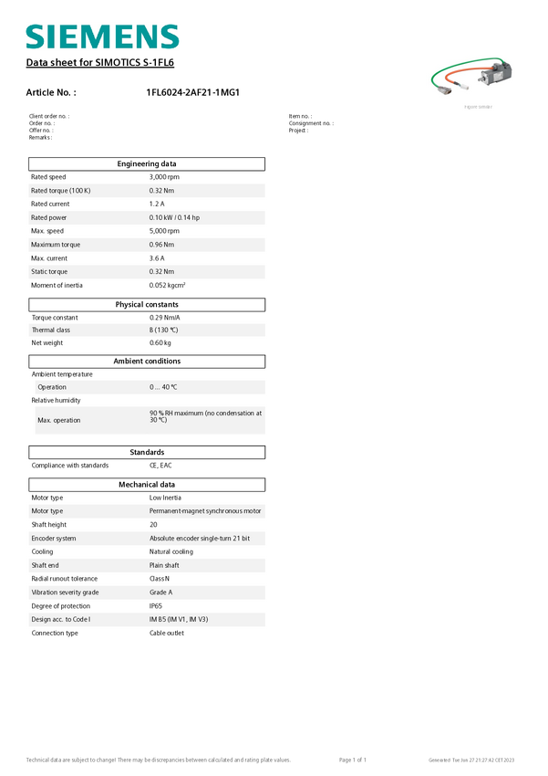 Silnik serwo Siemens 1FL6024-2AF21-1MG1 1FL60242AF211MG1