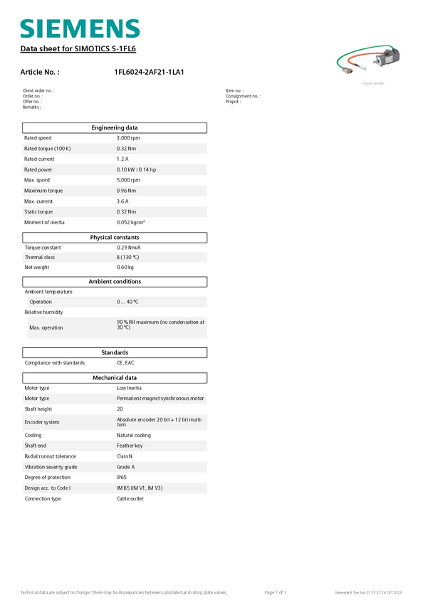 Silnik serwo Siemens 1FL6024-2AF21-1LH1 1FL60242AF211LH1