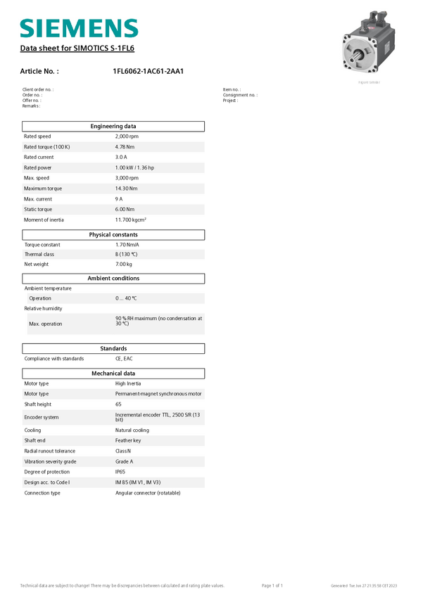 Silnik serwo Siemens 1FL6062-1AC61-2AB1 1FL60621AC612AB1