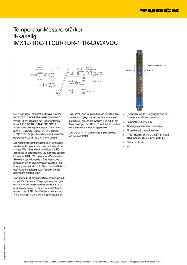 Wzmacniacz do pomiaru temperatury 1-kanałowy Turck IMX12-TI02-1TCURTDR- 1I1R-C0/24VDC 7580505