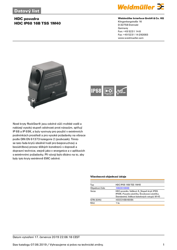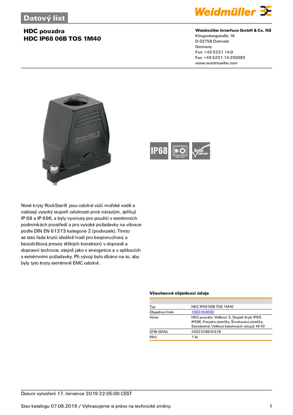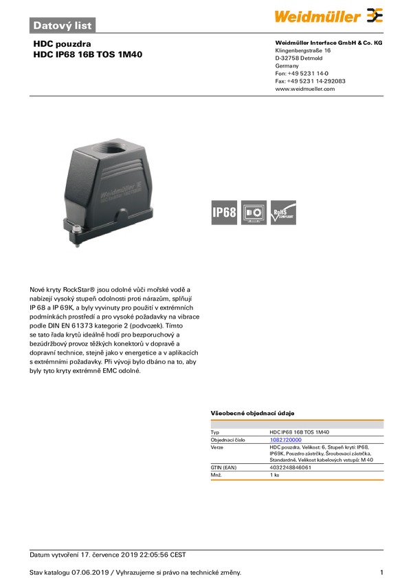 Weidmüller HDC IP68 06B TOS 1M40 1082450000 Obudowa złącza męskiego 1 szt.