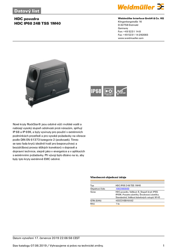 Weidmüller HDC IP68 24B TSS 1M40 1082980000 Obudowa złącza męskiego 1 szt.