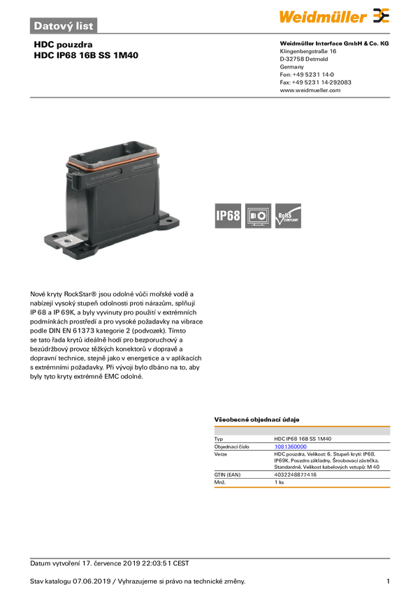Weidmüller HDC IP68 16B SS 1M40 1081360000 Obudowa podstawowa 1 szt.