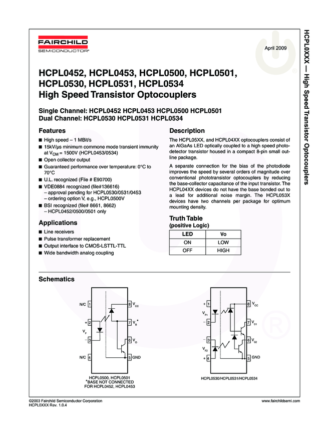 8-Pin DIP 1Mbit/s Dual-Channel High Speed Transistor Output Optocoupler <sub>(Not recommend for new design. The new equivalent part number is HCPL253xM)