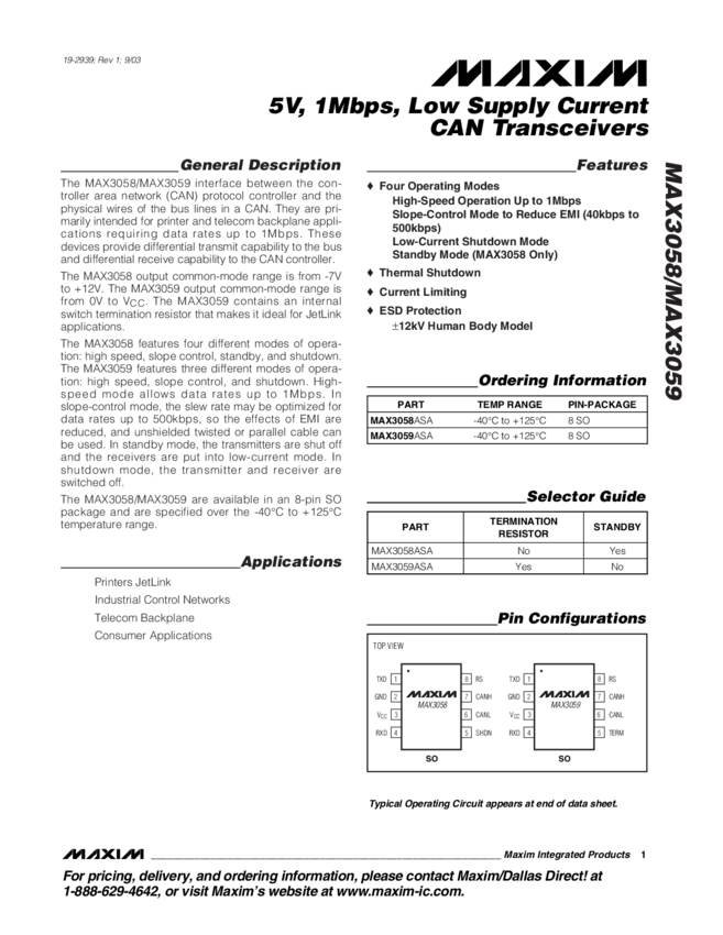 MAX3059 5V, 1Mbps, Low-Supply Current, CAN Transceiver, Internal Switch Terminaiton Resistor