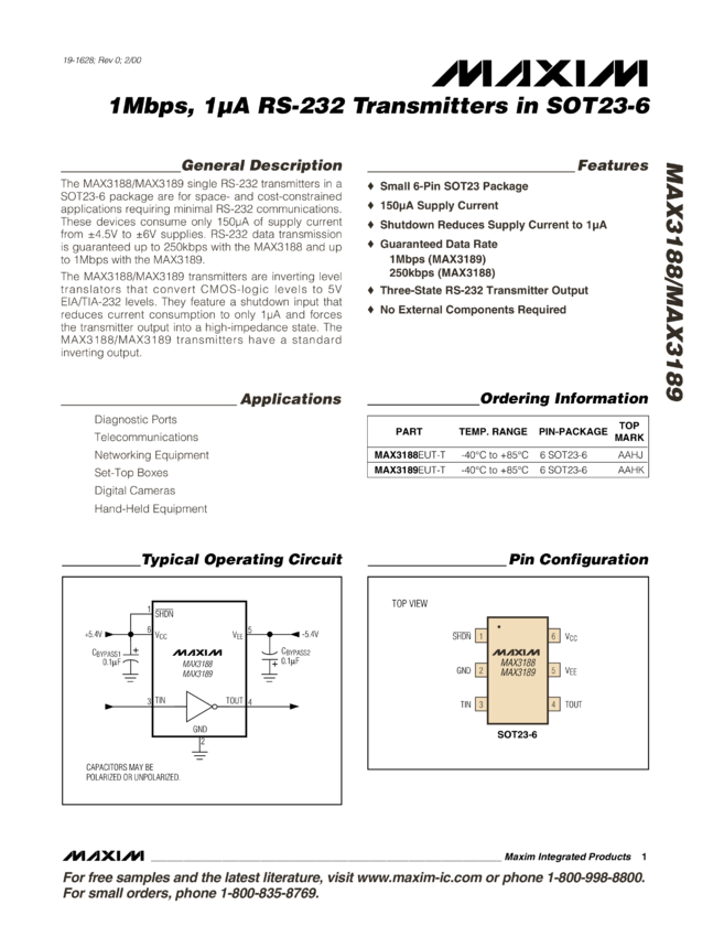 MAX3188, MAX3189 1Mbps, 1µA RS-232 Transmitters in SOT23-6