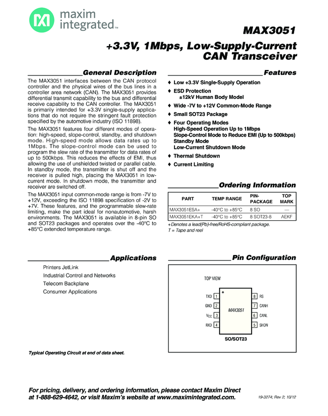 MAX3051 +3.3V, 1Mbps, Low-Supply-Current CAN Transceiver