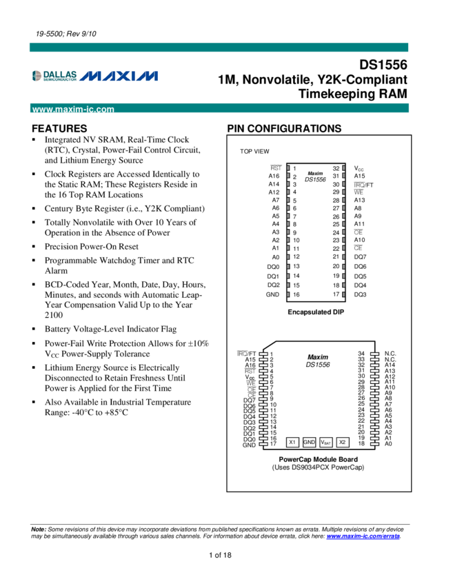 DS1556 1MEG NV Y2KC Timekeeping RAM
