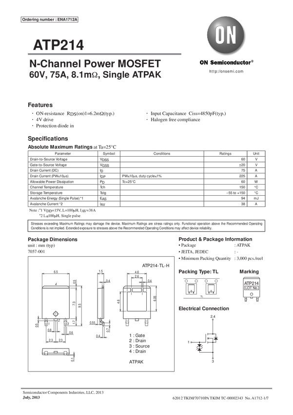 N-Channel Power MOSFET, 60V, 75A, 8.1mOhm, Single ATPAK
