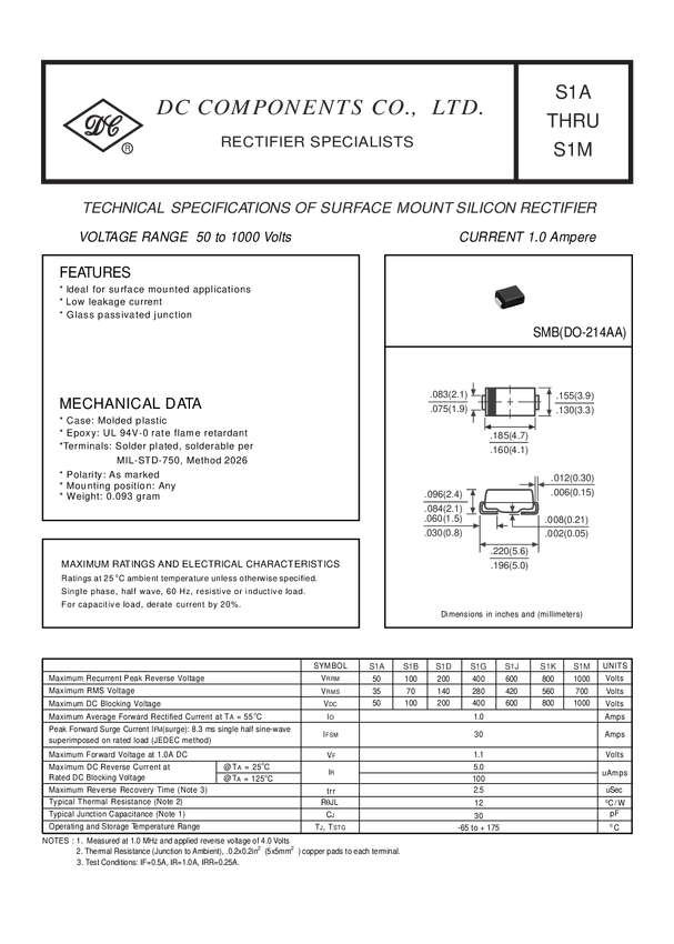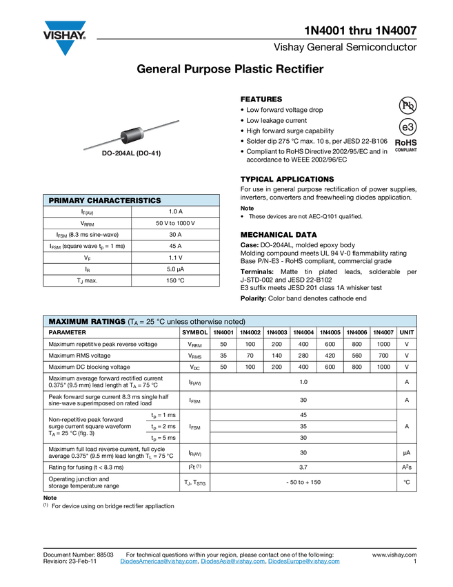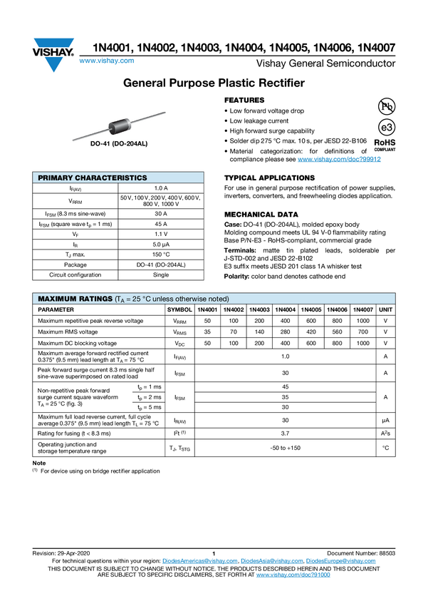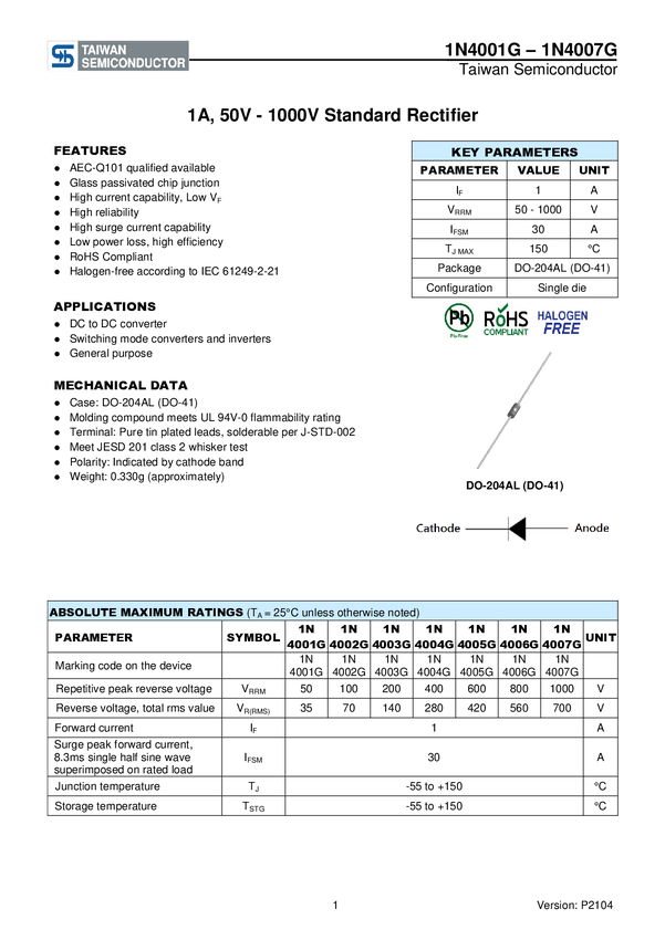 Standard Rectifier, 1000 V, 1.0 A