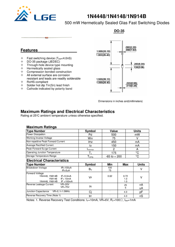 Dioda 150 mA, 100V, 4ns, DO35 LGE