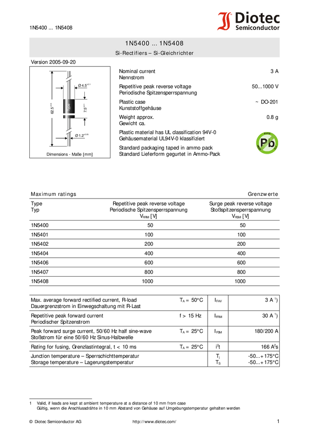 Dioda prostownicza Diotec 1 N 5400, DO 201, I(F) 3 A, U(R) 50 V