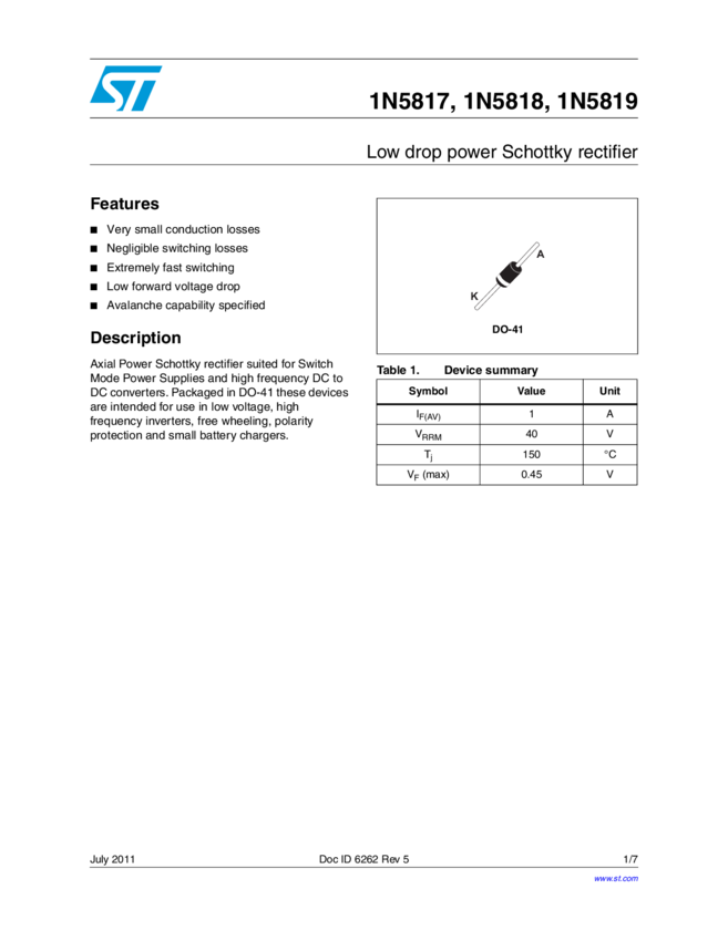 1.0 A, 40 V, Schottky Barrier Rectifier
