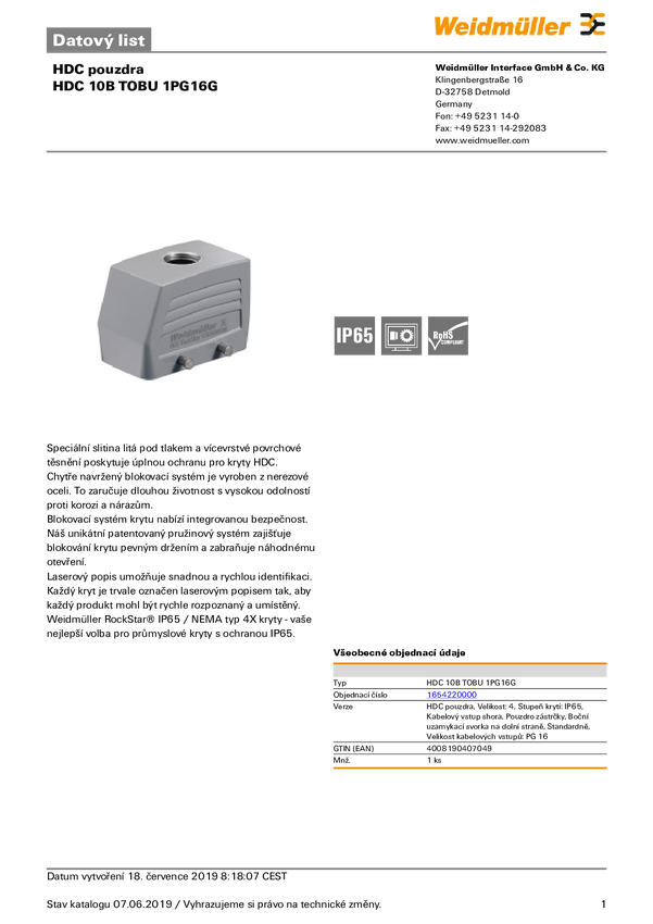 Weidmüller HDC 10B SBU 1PG16G 1654370000 Obudowa podstawowa 1 szt.