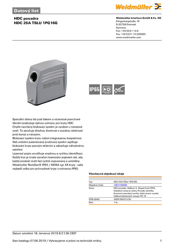 Weidmüller HDC 25A TSLU 1PG16G 1664730000 Obudowa złącza męskiego 1 szt.