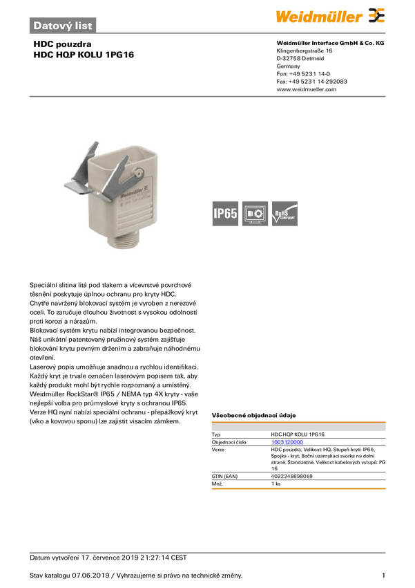 Weidmüller HDC HQP KOLU 1PG16 1003120000 Złącze przemysłowe Zawartość: 1 szt.
