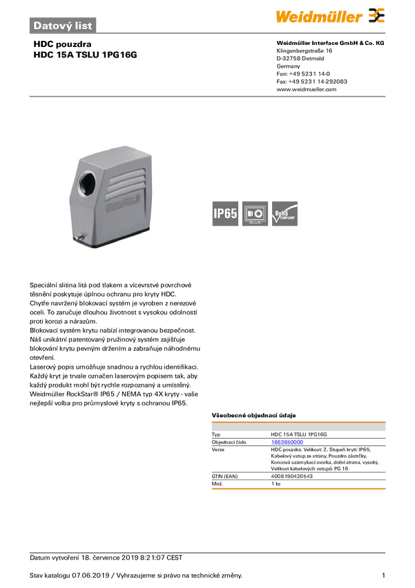 Weidmüller HDC 15A TSLU 1PG16G 1663850000 Obudowa złącza męskiego 1 szt.