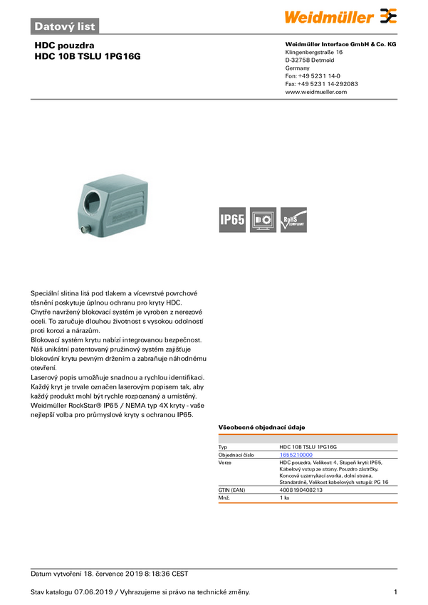 Weidmüller HDC 10B TSLU 1PG16G 1655210000 Obudowa złącza męskiego 1 szt.