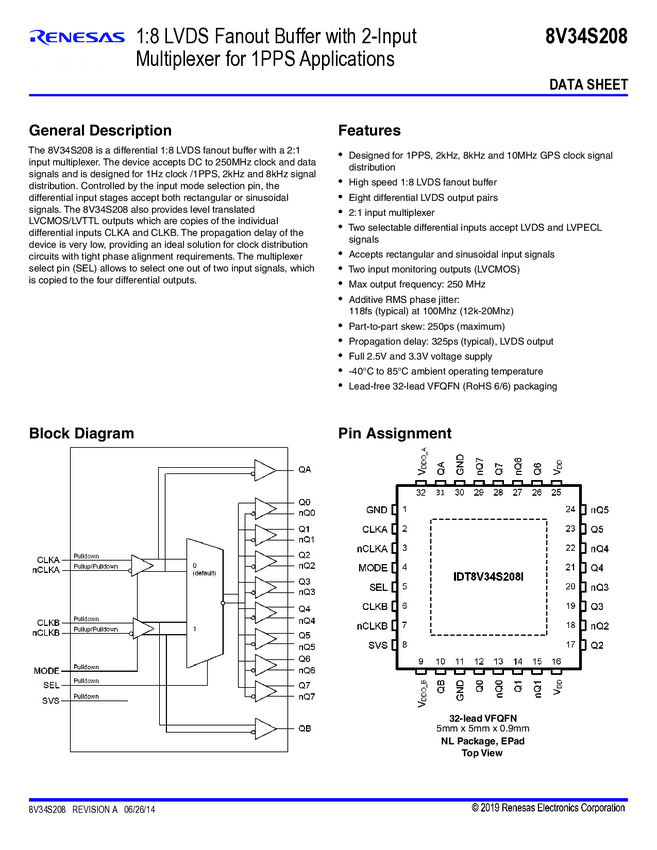 1:8 LVDS Fanout Buffer with 2-Input Multiplexer for 1PPS Applications