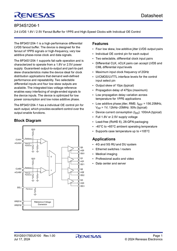 2:4 LVDS 1.8V/2.5V Fanout Buffer for 1PPS and High-Speed Clocks with Individual OE Control