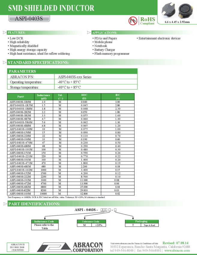 Ind Power Shielded Wirewound 470nH 20% 100KHz Carbonyl Powder 6A T/R
