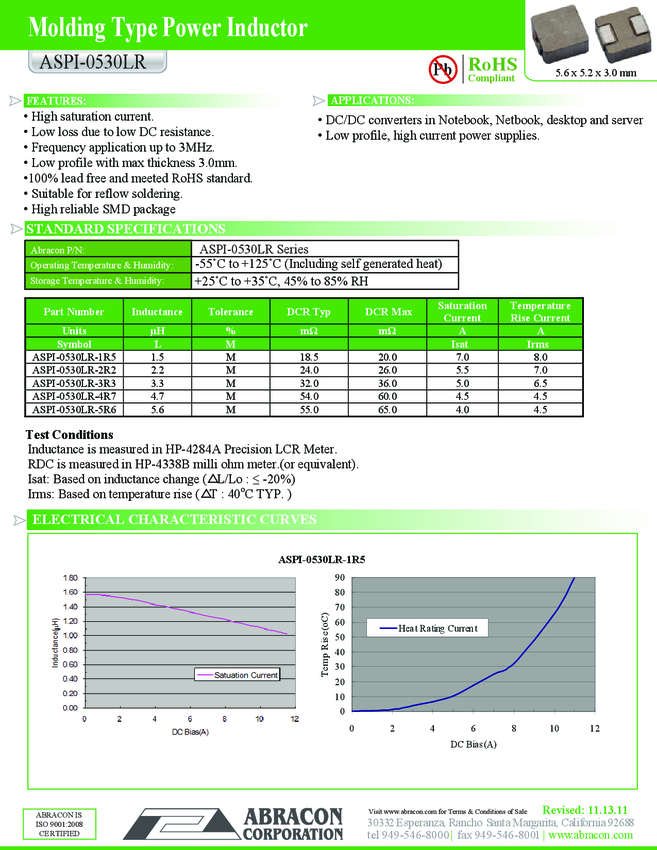 Ind Power Shielded Wirewound 470nH 20% 100KHz Carbonyl Powder 6A T/R