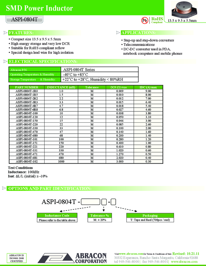 Ind Power Shielded 10uH 20% 100KHz Carbonyl Powder 9A T/R