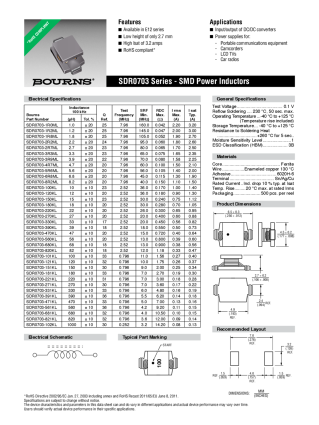 Ind Power Wirewound 2.7uH 20% 1KHz 22Q-Factor Ferrite 1.5A T/R