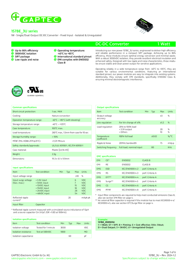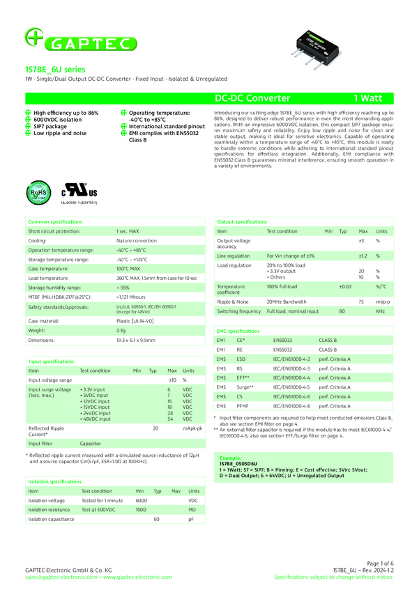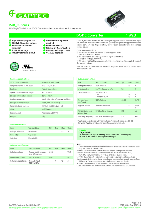 Gaptec 1S7BE_2403S6U Przetwornica DC/DC 1S7BE_6U, SIP-7 (5 Pins), 1 W, 303 mA, 1 szt.