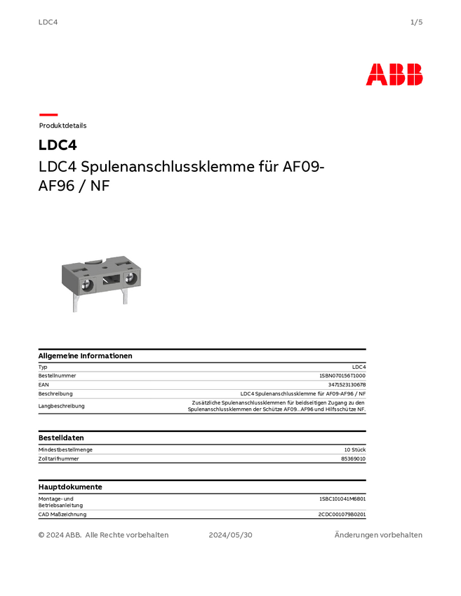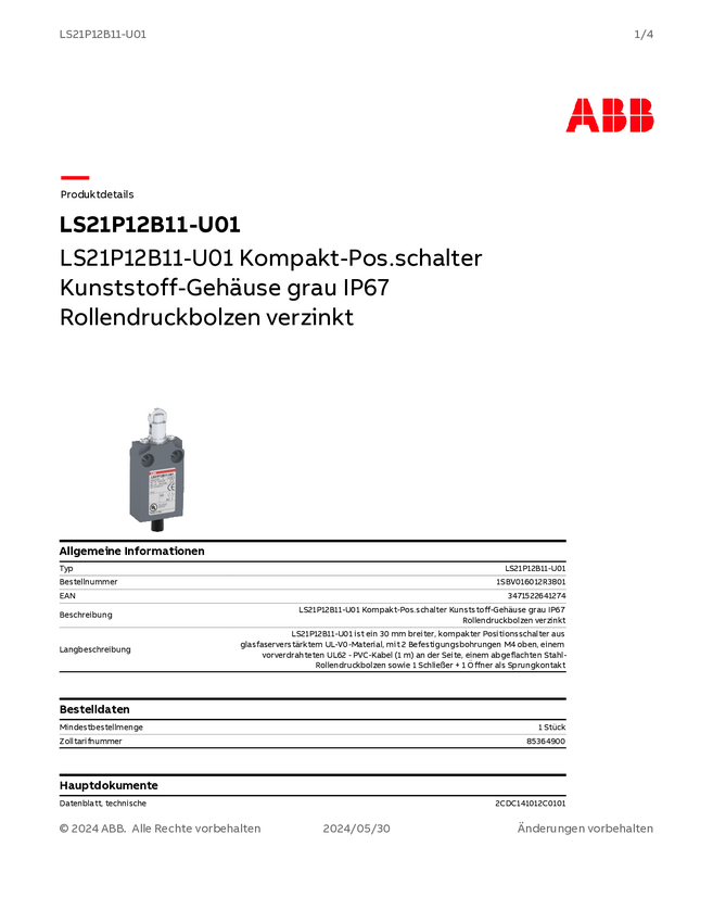 ABB 1SBV016024R3801 Przełącznik pozycyjny LS21P24B11-U01, 10 A, IP67, 1 szt.