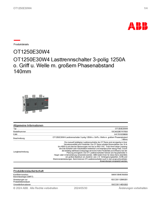ABB OT1250E30W4 Rozłącznik 1250 A 1000 V 1 szt.