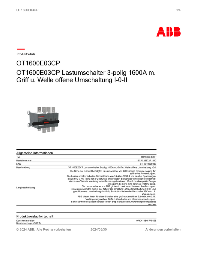 ABB 1SCA022872R1840 Przełącznik zmiany kierunku OT1600E03CP, 1000 V, 1600 A