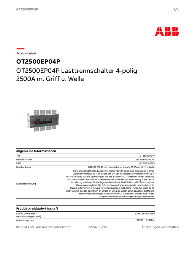 ABB 1SCA118458R1001 Rozłącznik OT2000EP04P, 1000 V