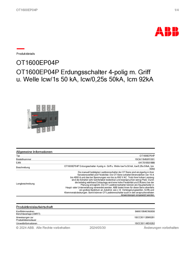 ABB 1SCA118456R1001 Rozłącznik OT1600EP04P, 1000 V, 1600 A