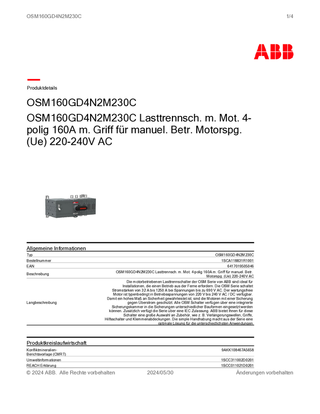 ABB OSM160GD4N2M230C Rozłącznik 160 A 1 szt.
