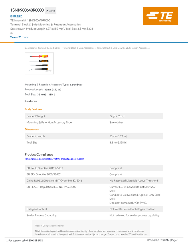 Accessories TE Connectivity 1SNK900640R0000 TE TAB Accessories, 1 szt.
