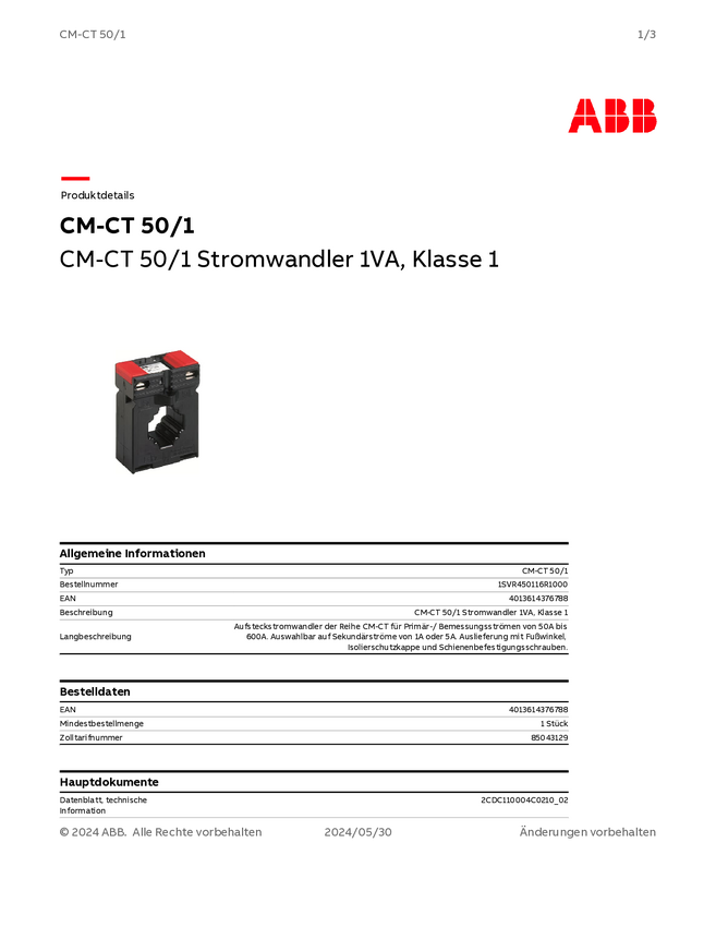 ABB CM-CT 50/1 Przekładnik prądowy Prąd pierwotny 50 A Prąd wtórny 1 A Średnica otworu:26 mm 1 szt.