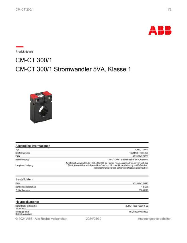 ABB CM-CT 300/1 1SVR450117R1100 Przekładnik prądowy Prąd pierwotny 300 A Prąd wtórny 1 A Średnica otworu:26 mm 1 szt.
