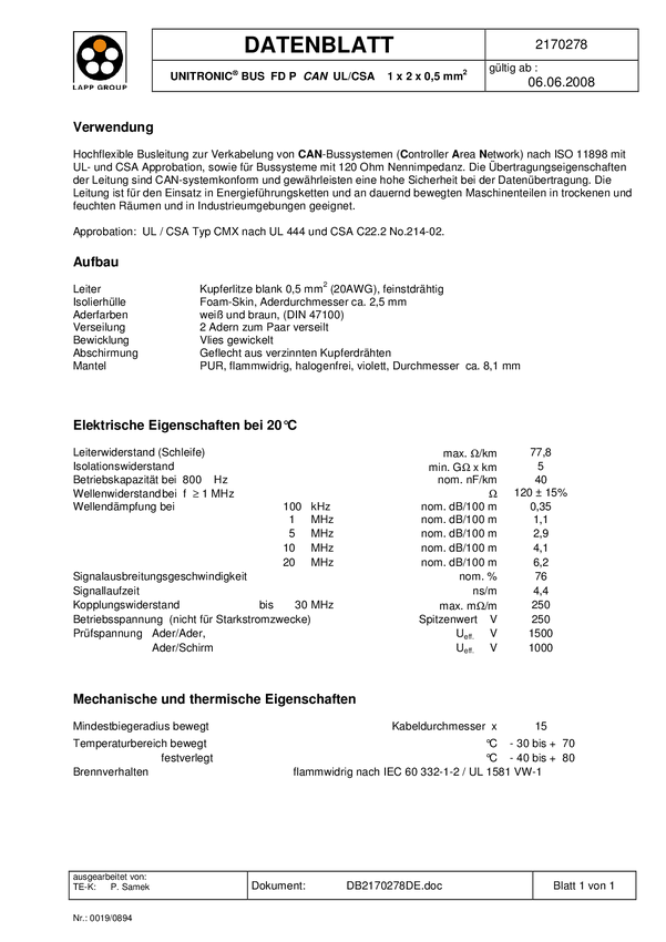 Przewód magistralny LAPP UNITRONIC BUS CAN FD P 1X2X0,5 2170278/100, 250 V, 120 Ω, 2 x 8 mm, 100 m