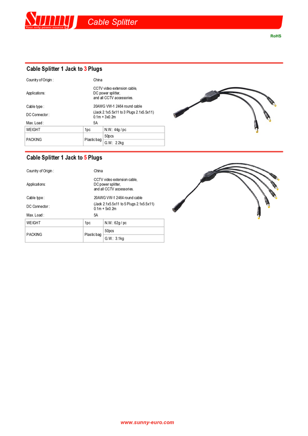 Rozdzielacz zasilania SUNNY 1 gniazdo x 3 wtyk 2,1x5,5mm