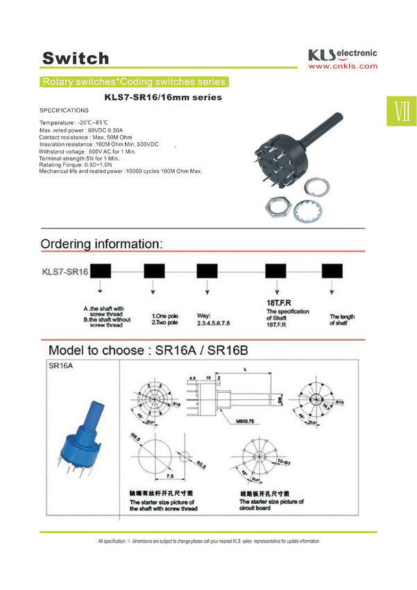 Przełącznik; obrotowy; SR16A-1x4-18T20; 4xON; 4 pozycje; bistabilny; THT; 1 tor; czarny; 0,3A; 60V DC; czarny; plastik; KLS