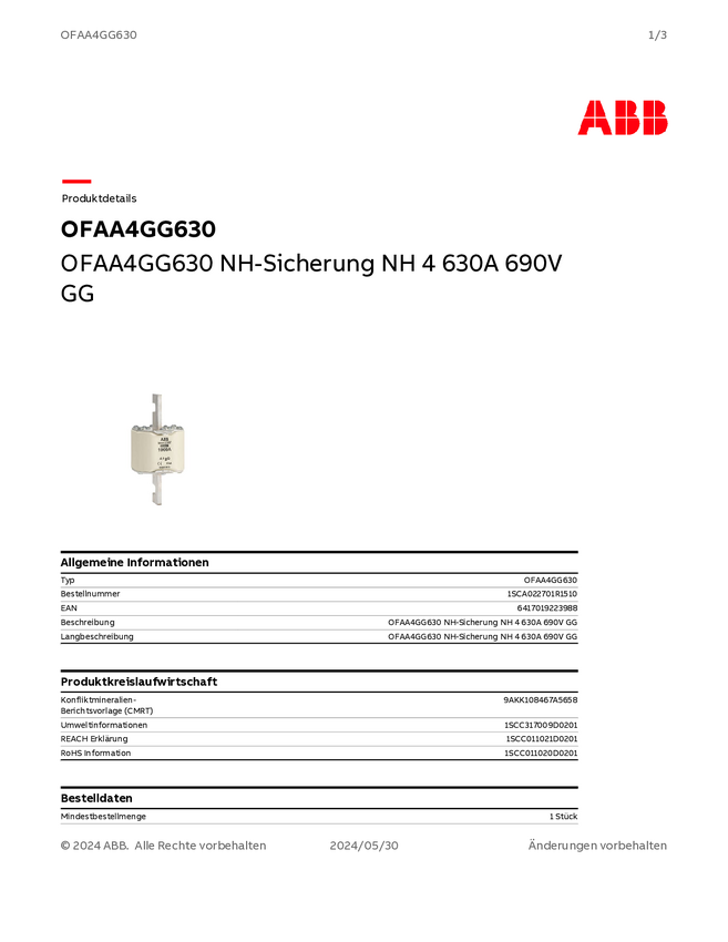 ABB 1SCA022701R1510 Bezpiecznik NH Rozmiar bezpiecznika = 1XL 630 A 690 V 1 szt.