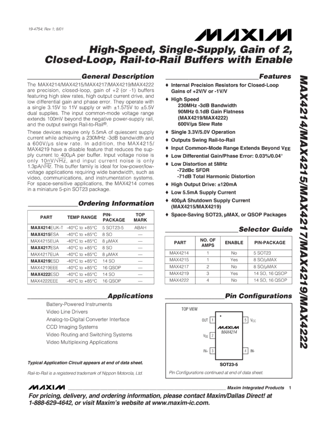 MAX4214, MAX4215, MAX4217, MAX4219, MAX4222 High-Speed, Single-Supply, Gain of 2, Closed-Loop, Rail-to-Rail Buffers with Enable