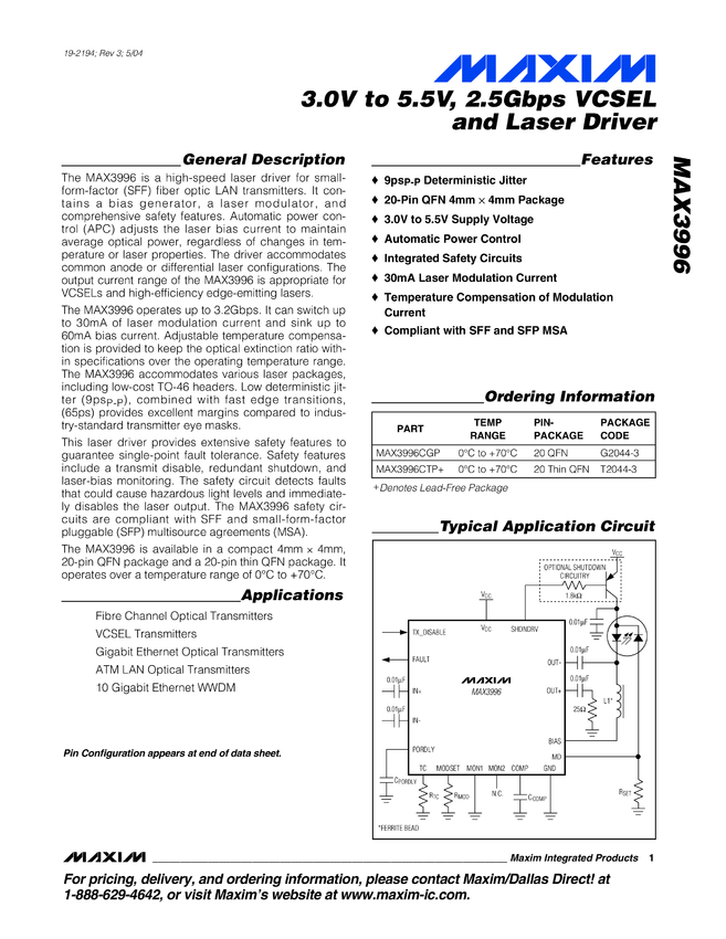 MAX3996 +3.0V to +5.5V, 2.5Gbps VCSEL and Laser Driver