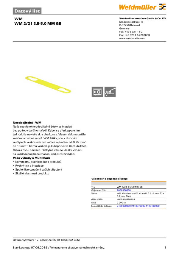 System znakowania kabli Weidmüller WM 2/21 3.5-5.0 MM GE 2006130000, 6.4 x 22 mm, 2000 szt.