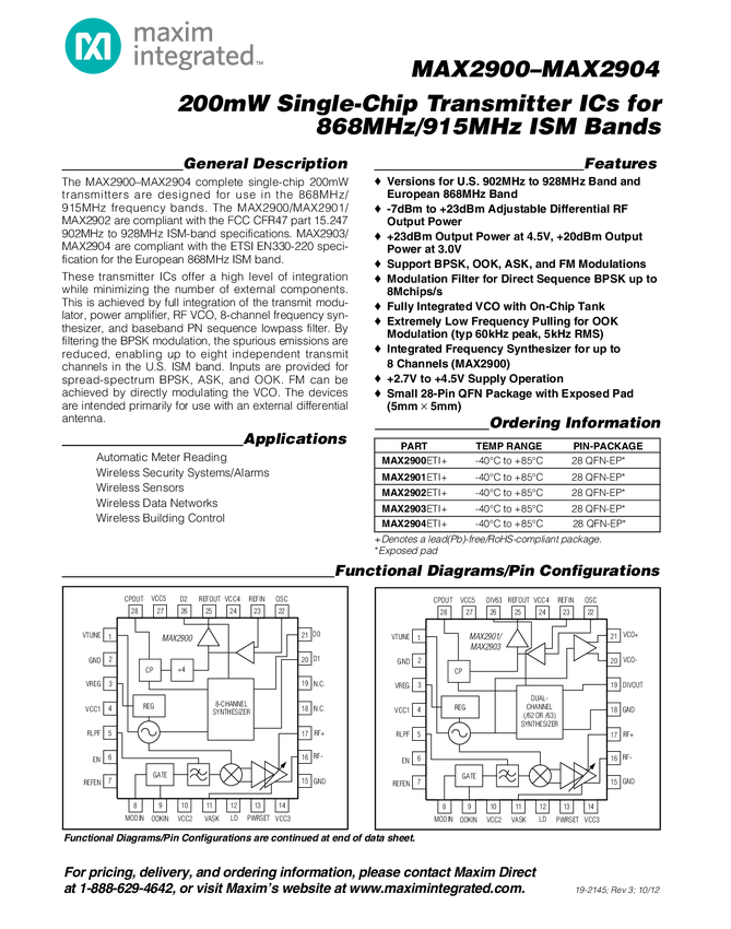 MAX2900, MAX2901, MAX2902, MAX2903, MAX2904 200mW Single-Chip Transmitter ICs for 868MHz/915MHz ISM Bands
