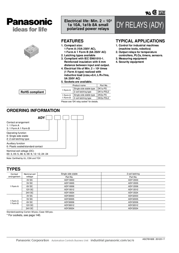 Przekaźnik Takamisawa 12V DC; SPST-NO Styki Gold-plate silver cadmium oxide; plastic sealed type nominal 12V DC 125 ohm; min 3,5 V DC; 1 pole 5 A; 200mW Medium load Control; 20x9,8x12,8+3mm; 2 styki 4 piny