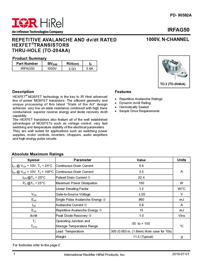 IRFAG50 is a high reliability, 1000V, single, N-channel MOSFET in a TO-204AA package. It utilizes HEXFET MOSFET technology to achieve low on-state resistance, high transconductance, and superior reverse energy and diode recovery dv/dt capability. Ideal for power supplies, motor controls, choppers, audio amplifiers, and other high-energy pulse circuit applications.
