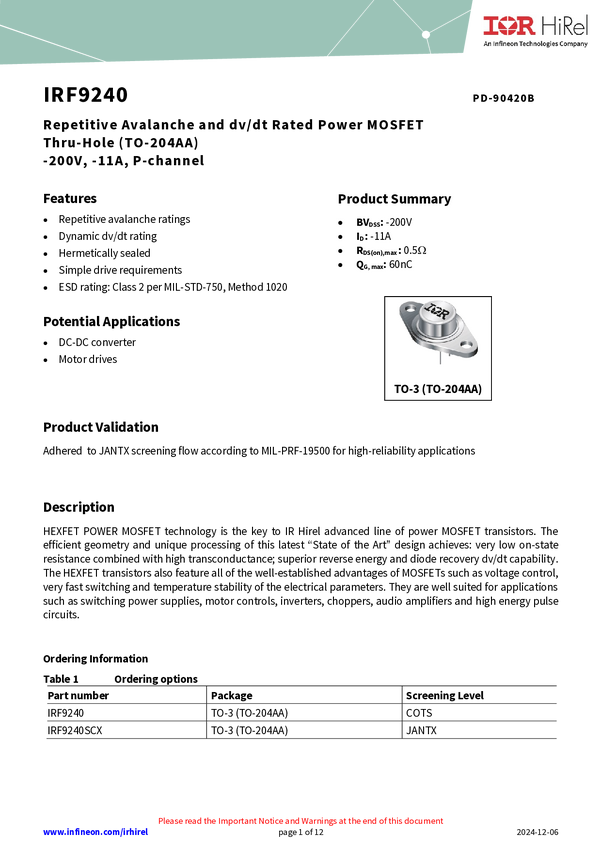 IRF9240 is a high reliability, -200V, single, P-channel MOSFET in a TO-204AA package. It utilizes HEXFET MOSFET technology to achieve low on-state resistance, high transconductance, and superior reverse energy and diode recovery dv/dt capability. Ideal for power supplies, motor controls, choppers, audio amplifiers, and other high-energy pulse circuit applications.