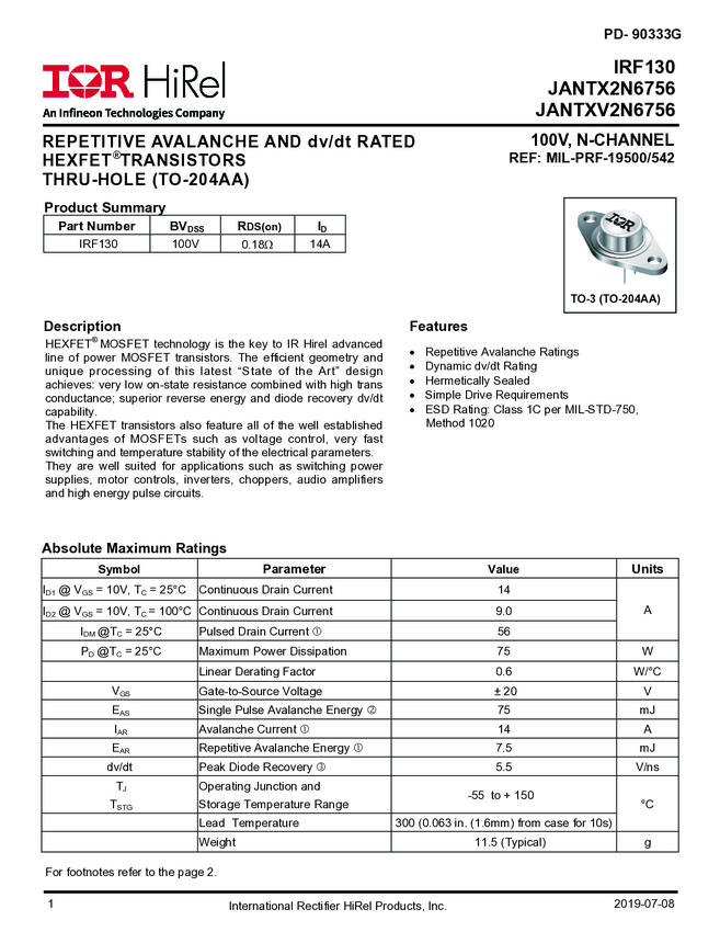 JANTXV2N6756 is a high reliability, 100V, single, N-channel MOSFET in a TO-204AA package. It utilizes HEXFET MOSFET technology to achieve low on-state resistance, high transconductance, and superior reverse energy and diode recovery dv/dt capability. Ideal for power supplies, motor controls, choppers, audio amplifiers, and other high-energy pulse circuit applications. It has TXV level screening and is suitable for defense applications.